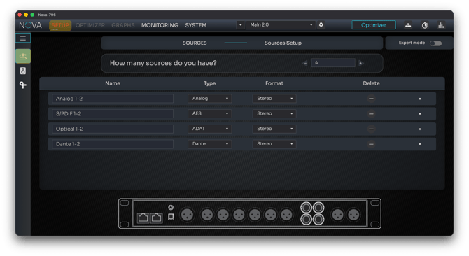 Configure NOVA sources when using it as a Monitor Controller. Learn how to add, rename, route, and manage sources in Basic or Expert mode.