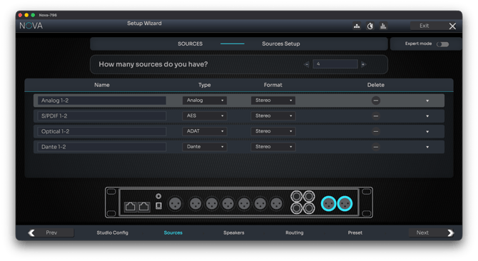 Expert mode provides full control over source behavior and routing:
