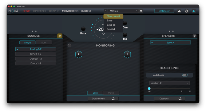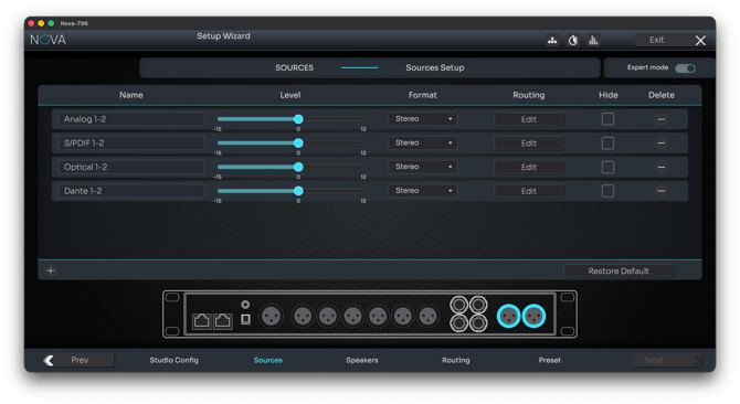 - A Restore to Default button recalls the factory source configuration for NOVA.