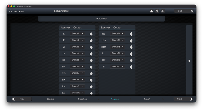 Altitude processors perform all speaker-to-output assignment here, during the Routing step. Outputs are displayed as numbered channels, and the processor uses product-specific rules to determine which physical connectors those channels are sent to.