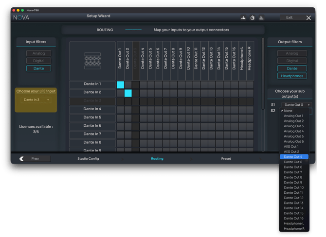 Routing simply consists of selecting the physical output used for each speaker, using the output dropdown menu on its corresponding line.