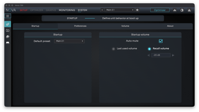 NOVA includes a dedicated Startup volume section, letting you define how the unit handles output level at boot-up.