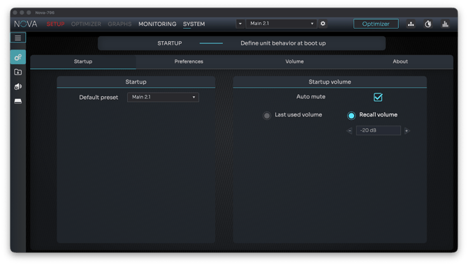 NOVA inclut une section dédiée Volume de démarrage, vous permettant de définir comment l'unité gère le niveau de sortie au démarrage.